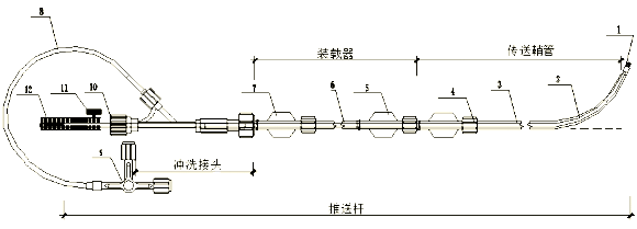 1.推送桿螺絲;2.推送桿;3.傳送鞘管;4.傳送鞘管座;5.裝載器頭端座;6.裝載器導(dǎo)管;7.裝載器尾端座;8.延長(zhǎng)管;9.三通閥;10.止血閥;11.緊固螺絲;12.旋轉(zhuǎn)手柄